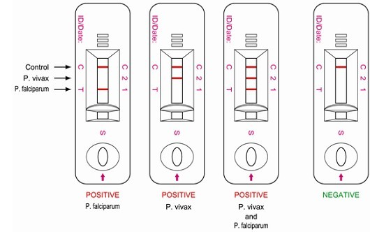 三條測(cè)試線都出現(xiàn),表明惡性瘧原蟲(chóng)和間日瘧原蟲(chóng)都為陽(yáng)性。