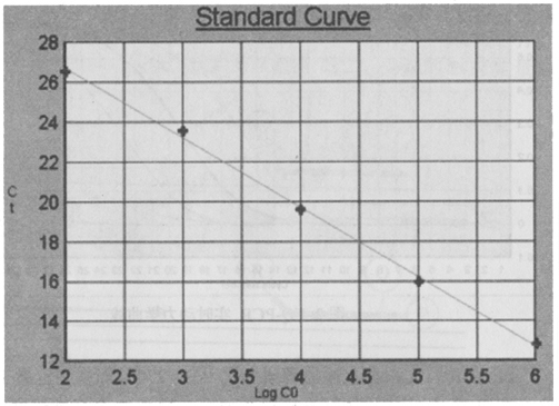 ABI公司首先根據(jù)上述原理研制了ABI 7700 等系列定量PCR儀,在PCR反應(yīng)中設(shè)置標(biāo)準(zhǔn)模板系列(一般5~7個(gè)標(biāo)準(zhǔn)濃度)反應(yīng)管和空白對(duì)照管。通過(guò)實(shí)時(shí)檢測(cè)反應(yīng)管中的熒光信號(hào),計(jì)算出RQ+、RQ-、△RQ。RQ+代表樣品管熒光報(bào)告基團(tuán)發(fā)光強(qiáng)度與淬滅基團(tuán)發(fā)光強(qiáng)度的比率,RQ-代表空白管中二者的比率,△RQ(△RQ = RQ+-RQ-)代表PCR過(guò)程中熒光信號(hào)變化量。當(dāng)熒光信號(hào)增強(qiáng)到某一閾值(根據(jù)熒光信號(hào)基線(xiàn)的平均值和標(biāo)準(zhǔn)差,計(jì)算出以99.7%的置信度大于平均值作為閾值)時(shí),標(biāo)準(zhǔn)模板反應(yīng)管所用的循環(huán)次數(shù)(Ct值)就被記錄下來(lái)。Ct值與標(biāo)準(zhǔn)模板數(shù)量的對(duì)數(shù)值之間有嚴(yán)格的線(xiàn)性關(guān)系[3],利用系列標(biāo)準(zhǔn)模板的Ct值,制成標(biāo)準(zhǔn)曲線(xiàn)(圖3),根據(jù)待測(cè)樣品的Ct值,就可在標(biāo)準(zhǔn)曲線(xiàn)中確定待測(cè)樣品起始的DNA數(shù)量。根據(jù)數(shù)據(jù)處理,即可得出定量結(jié)果。探針設(shè)計(jì)一般應(yīng)符合以下條件[2]:①探針長(zhǎng)度應(yīng)在20~40個(gè)堿基左右,以保證結(jié)合的特異性。②GC堿基含量在40%~60%,避免單核苷酸序列的重復(fù)。③避免與引物發(fā)生雜交或重疊。④探針與模板結(jié)合的穩(wěn)定程度要大于引物與模板結(jié)合的穩(wěn)定程度,因此探針的Tm值要比引物的Tm值至少高出5℃。另外,探針的濃度,探針與模板序列的同源性,探針與引物的距離都對(duì)實(shí)驗(yàn)結(jié)果有影響。