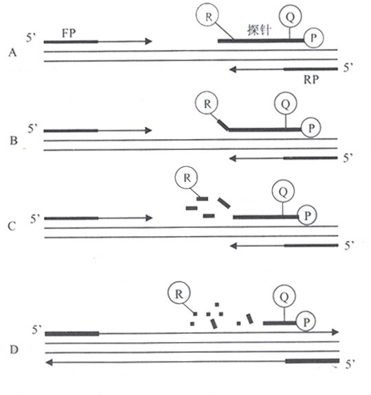 PCR技術(shù)是通過(guò)對(duì)基因的選擇性片段進(jìn)行體外高效擴(kuò)增,實(shí)現(xiàn)目的基因的檢測(cè)。熒光探針定量PCR(FQ-PCR)是一種新的基因定量檢測(cè)技術(shù),國(guó)外文獻(xiàn)多用“實(shí)時(shí)定量PCR(real time quantitative PCR)”或“TaqMan PCR(以美國(guó)PE公司商標(biāo)命名) ”。該技術(shù)是在常規(guī)PCR基礎(chǔ)上加入熒光標(biāo)記探針,巧妙地把核酸擴(kuò)增(PCR)、雜交及光譜技術(shù)結(jié)合在一起,從而實(shí)現(xiàn)了對(duì)目的基因的準(zhǔn)確定量檢測(cè),正發(fā)展成為臨床實(shí)驗(yàn)診斷的常規(guī)技術(shù)。
