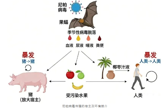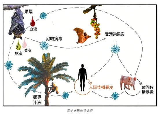 是一種人畜共患病毒,可以在動(dòng)物和人之間傳播,最主要感染的兩種動(dòng)物,就是我們?nèi)粘>湍芤姷?,甚至農(nóng)村地區(qū)還能時(shí)常接觸到的動(dòng)物:果蝠和豬。