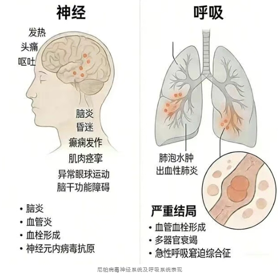 ?尼帕病毒一旦發(fā)展為重癥,可累及呼吸系統(tǒng)及神經(jīng)系統(tǒng)。